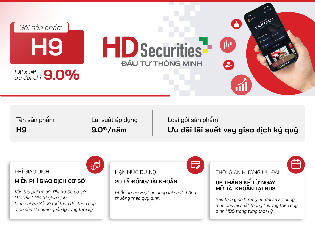 Bên cạnh đó, HDS cũng đang áp dụng chương trình ưu đãi gói sản phẩm H9 với lãi vay Margin 9% dành riêng cho khách hàng mở mới.